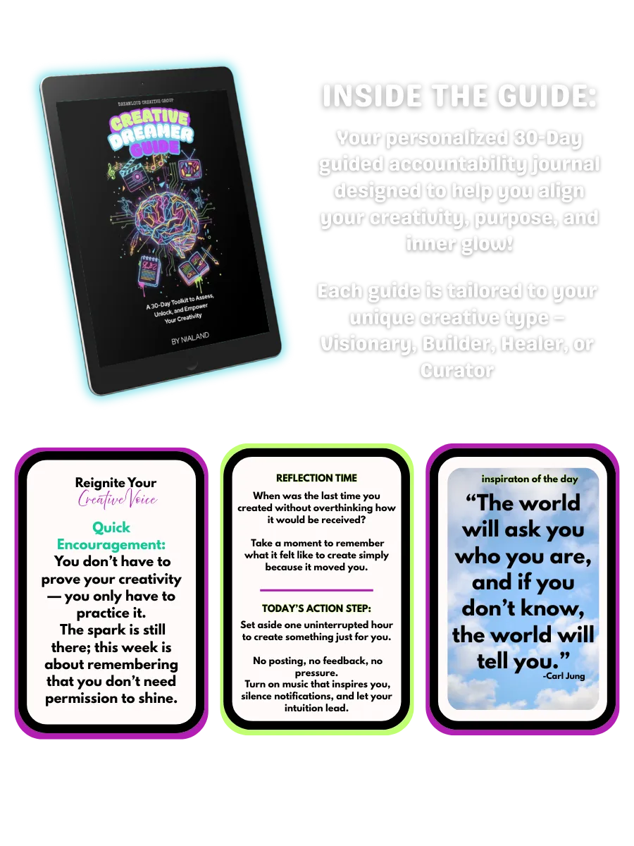 That’s exactly why Nialand created The Creative Dreamer Guide — a 30-day toolkit to help you assess where you are, rediscover what drives you, and build habits that keep your creativity alive every day.